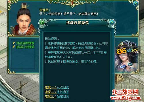 镜像挑战系统是一项自我训练和比拼的玩法,洛阳城内找到李世民,可以随时参加镜像挑战。这是一个检验自己实力的地方,只有打败自己,才能在江湖中生存下去。挑战自己的镜像,共分为三种难度,分别是:认识自我、挑战自己和超越自我,人生在世,无非就是一个与人斗与天争的过程,在《大唐真龙贰》中全面的认识自己,甚至超越自己,也不枉此生之行了。