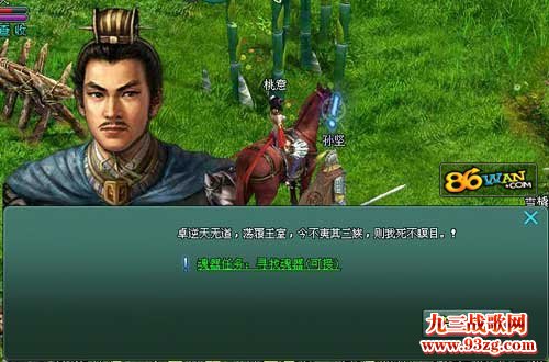 6711《盛世三国》的魂器系统需要通过支线任务开启,不同的国家开启任务的NPC不同。自动寻路找到本国的NPC后,完成从强盗手中救下主公的宠物精灵之魂的任务,魂器任务NPC就会将精灵之魂赠与玩家,这便是魂器。